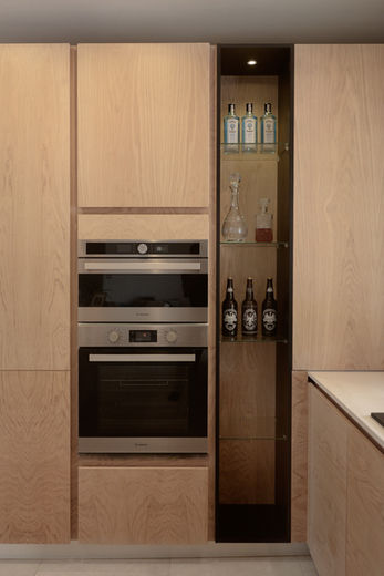 Crafted from oak veneer with black accents, this kitchen embraces a minimalist aesthetic with Scandinavian inspiration. The choice of textures and materials was guided by the desire to create a refined space, in harmony with the Mauritian art of living.