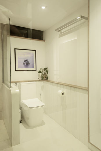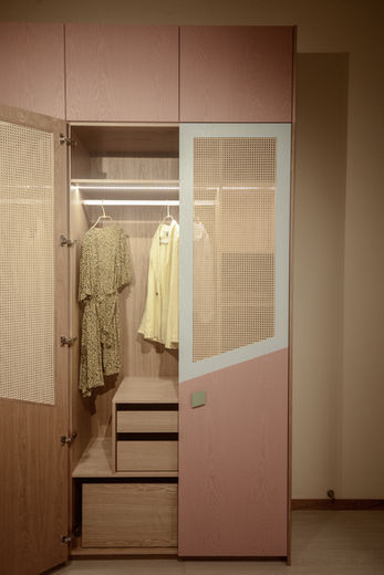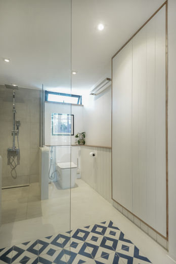 Ce projet a été l’occasion de concevoir un aménagement entièrement sur-mesure, mêlant minimalisme et esprit tropical. Dans la chambre, une coiffeuse en chêne massif aux lignes épurées s’intègre naturellement à l’atmosphère chaleureuse et végétale. Un coin lecture et détente, imaginé comme une véritable parenthèse de calme, met en dialogue formes simples et matériaux bruts pour un confort discret. La suite parentale et sa salle de bain attenante prolongent cette harmonie: le béton ciré, les carreaux de ciment et les accents de chêne créent un équilibre élégant et décontracté, rehaussé par un éclairage subtil qui évoque la douceur d’une maison de vacances.