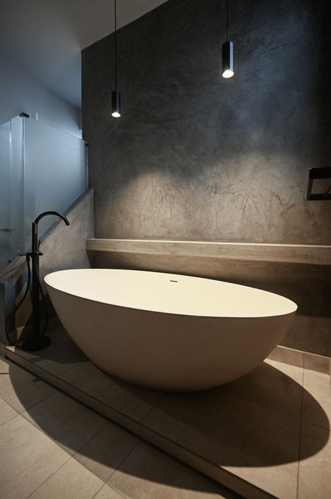 Intégrer une baignoire dans un espace réduit fut le principal défi de cette salle de bain. Le jeu d’ombres et de lumières magnifie les lignes de la baignoire, tandis que le contraste entre béton poli et surfaces lisses évoque une oasis intime et contemporaine. Un plan vasque en acier de 8 mm, suspendu au mur, vient compléter cet agencement avec légèreté et élégance.